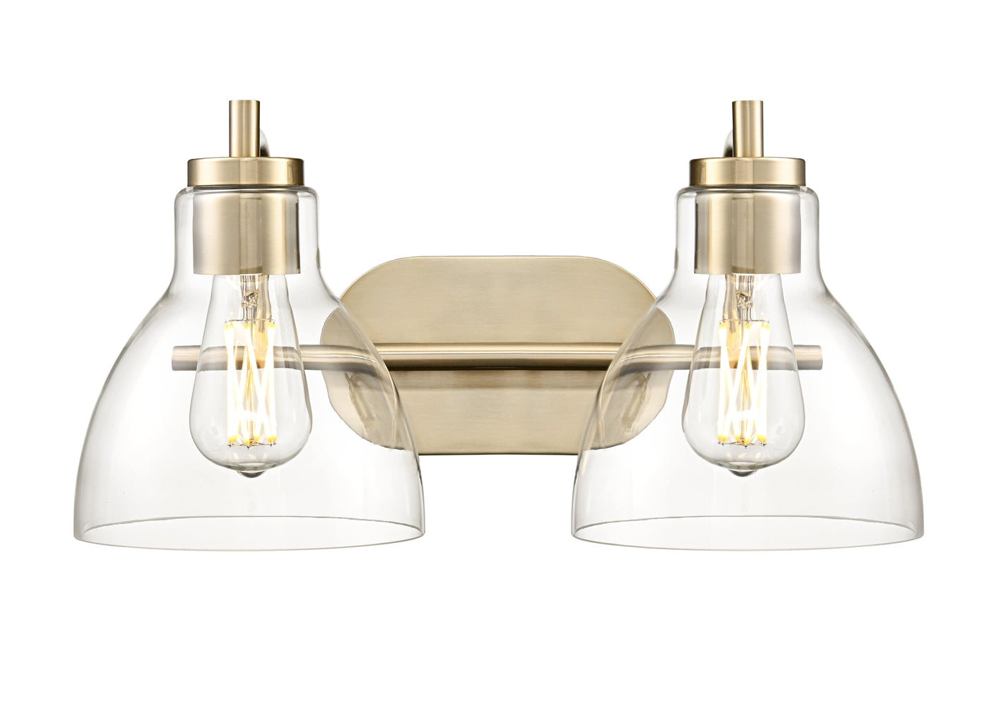 Graceful bell-shaped clear glass shades set an elegant tone and provide a crisp clear lighting effect perfect for any bath.