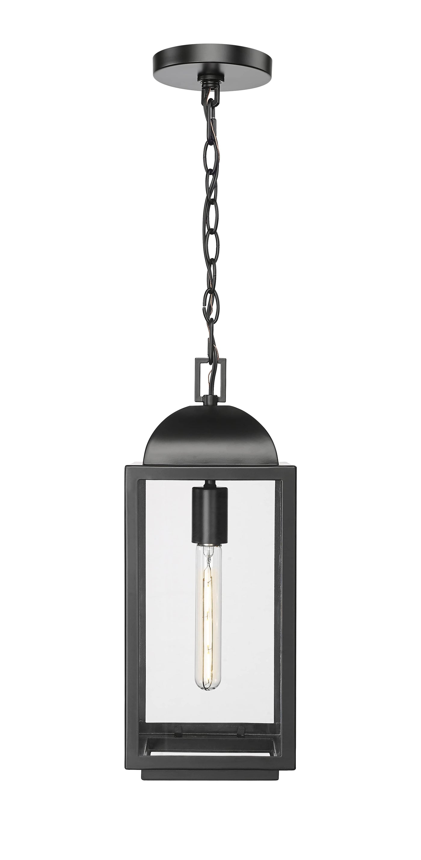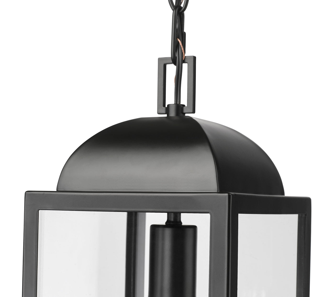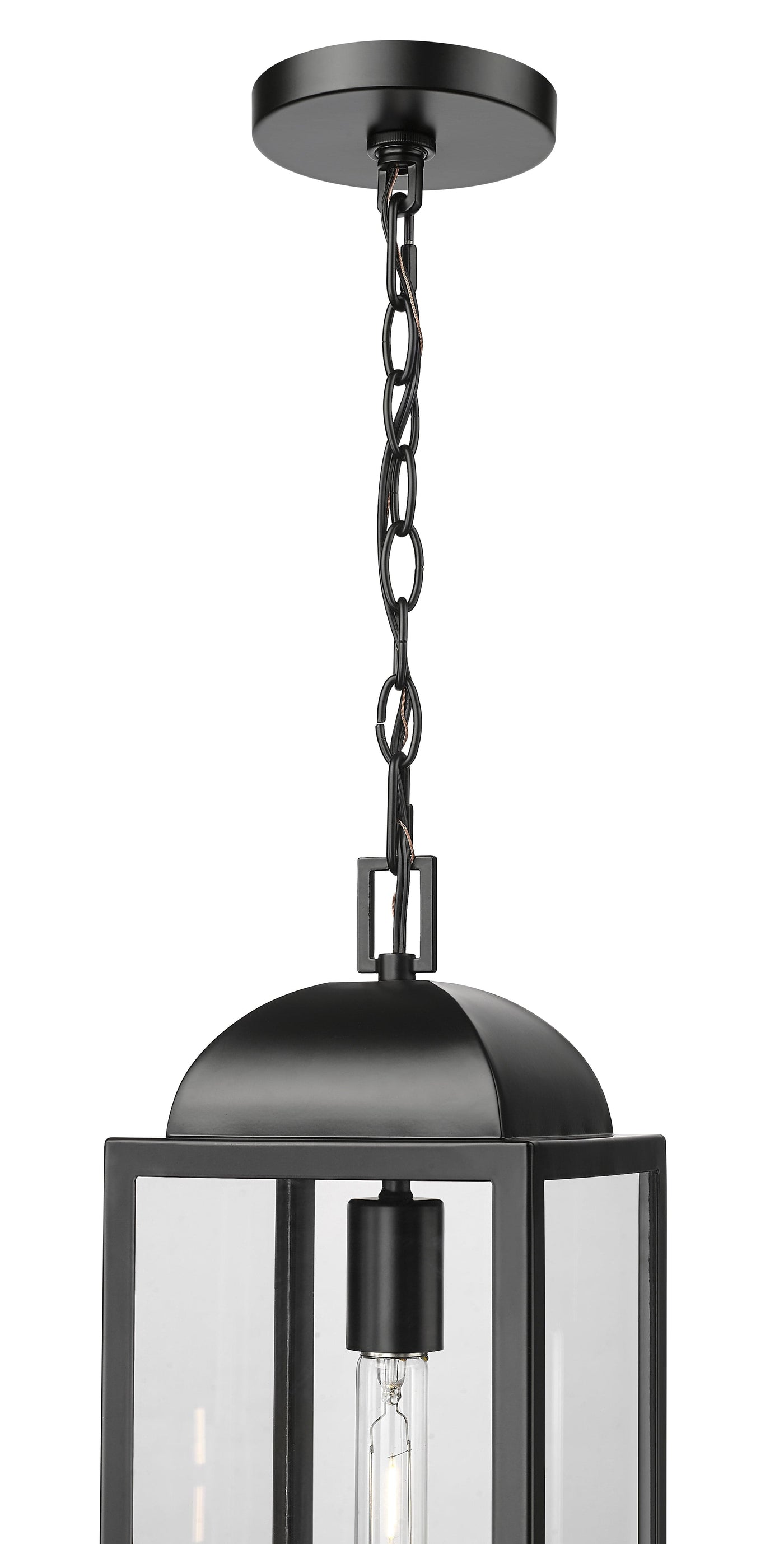 Tradition details are reimagined in clean angular lines and finished in elegant powder coat black with clear glass panels, perfect for framing vintage-style bulbs.