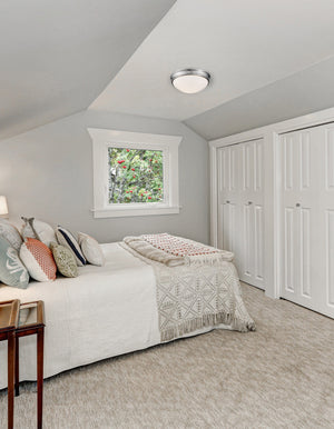 This Flush Mount Fixture is available in a Brushed Nickel Finish and includes Etched White Glass.
