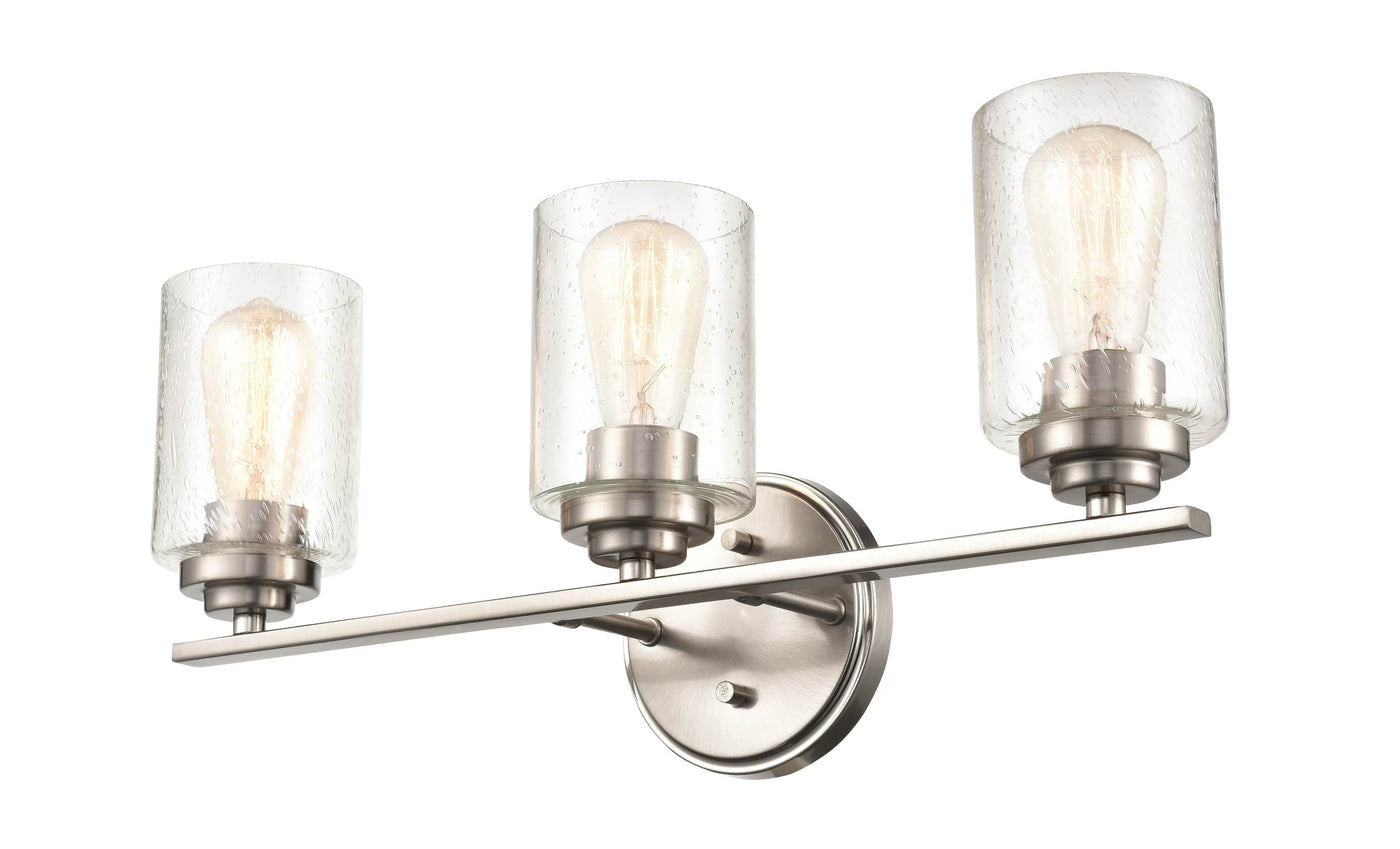 This Vanity Light features a Satin Nickel finish and Clear Seeded glass.The fixture is 22in Wide and requires 3x 100W A19 Incandescent Light Bulbs or equivalent.The back plate measures 5in Width by 5in Height.This Vanity Light is UL Listed and rated for Damp Locations. View More
