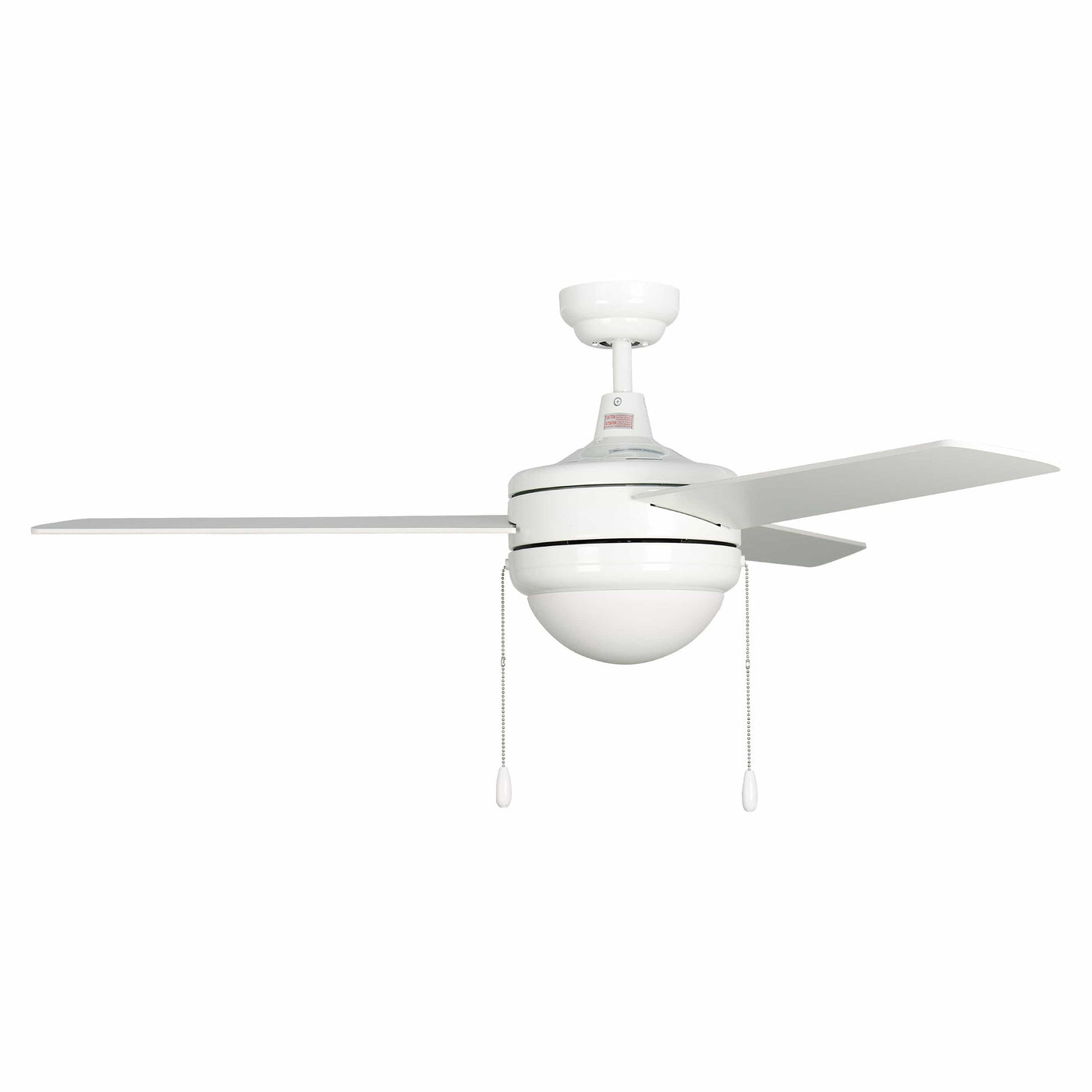 The Contempo features three painted plywood blades, 3-speed reversible AC motor, a satin white glass shade, and LED light kit with standard pull chain.