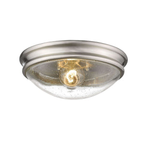 This Flush Mount Fixture is available in a Brushed Nickel Finish and includes Clear Seeded Glass.