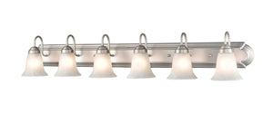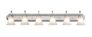 This 6-light bathroom vanity fixture features a Satin Nickel finish and Faux Alabaster glass.