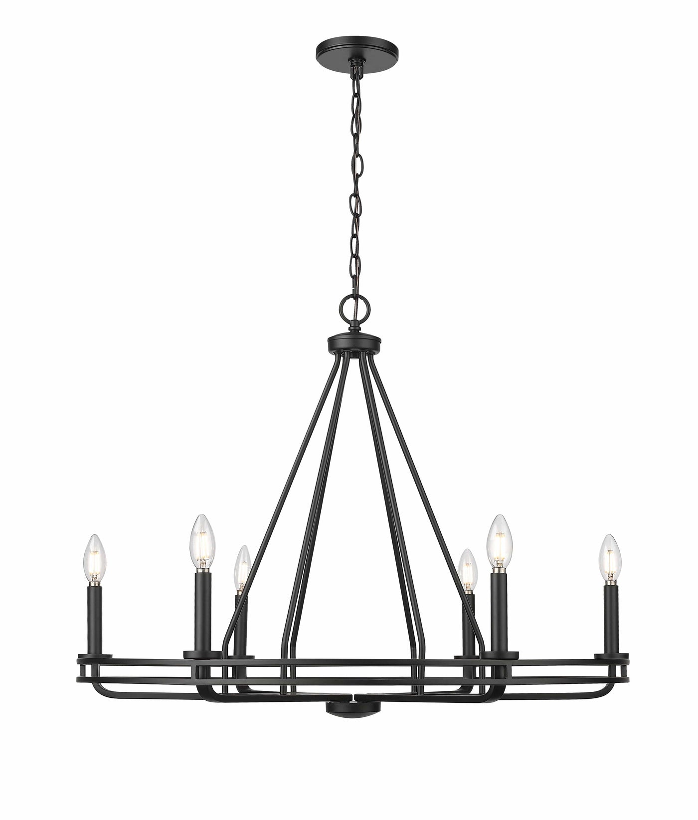 The Jody Family of chandelier lighting is a whimsical take on the traditional wagon wheel candelabra silhouette.