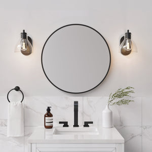 Graceful bell-shaped clear glass shades set an elegant tone and provide a crisp clear lighting effect perfect for any bath.