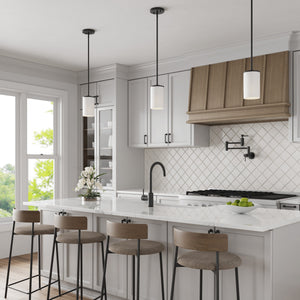 Cylindrical shades, in clear or white glass, perfectly compliment the sleek lines of these luminaires finished in brushed nickel, chrome, matte black, or modern gold.