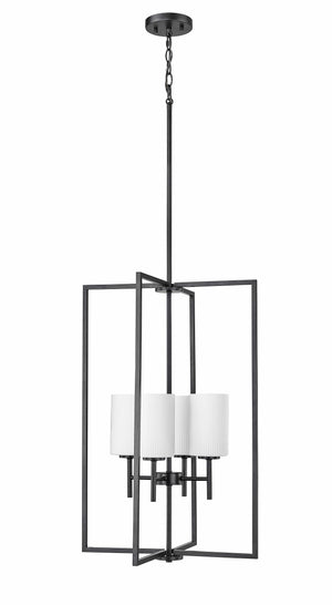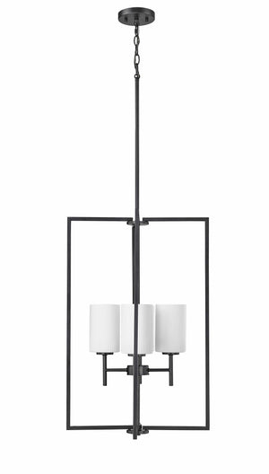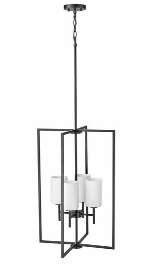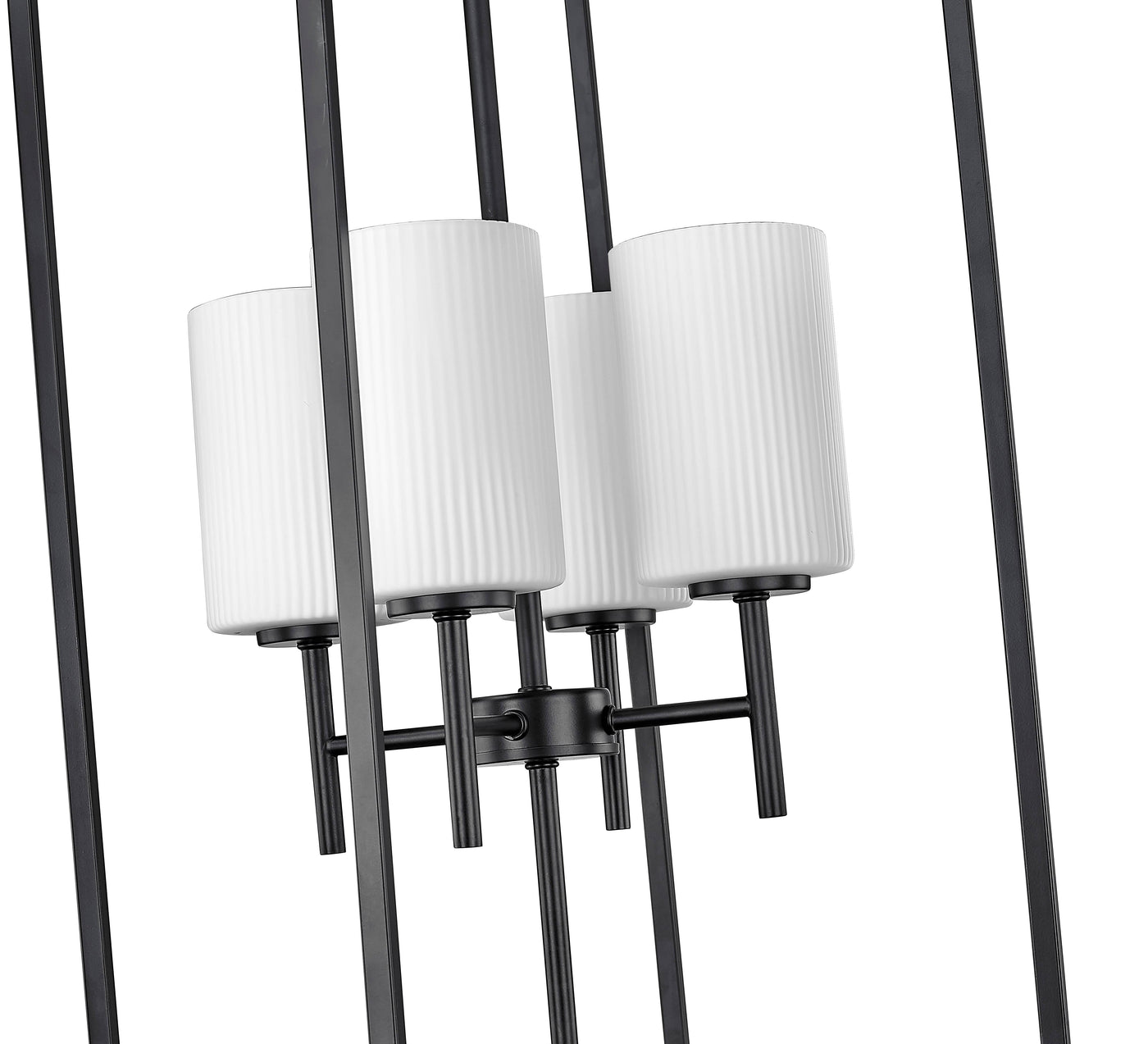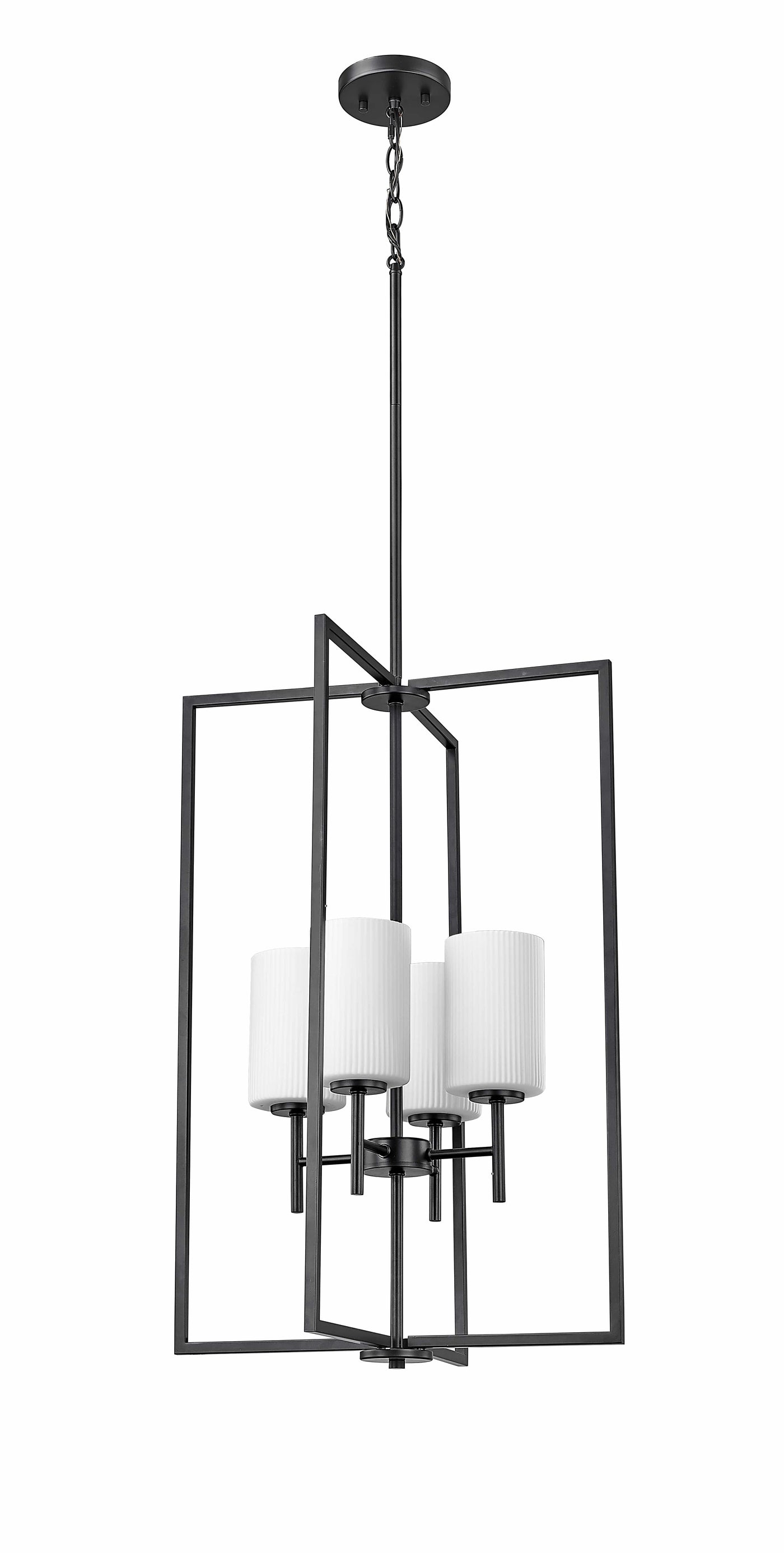 A true statement piece for any kitchen or entryway, the Luxx family of pendant lighting incorporates angular lines to provide a dramatic framework for the 4-lights and the ribbed etched, opal white glass globes.