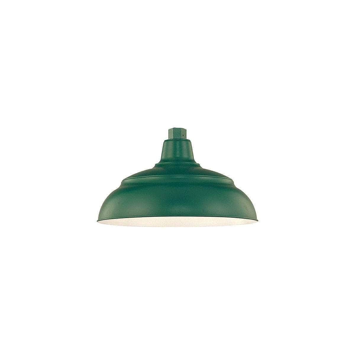 The Satin Green Warehouse Light Fixture has a 14" Shade Diameter and 8-1/4" Shade Height. All RLMs are manufactured using Cold-Rolled Steel and Die-Cast Zinc, and the Architectural Bronze, Satin Black, Satin Green, Satin Red, and White finishes are electrostatically sprayed and oven baked with UV stabilized paint ap... View More