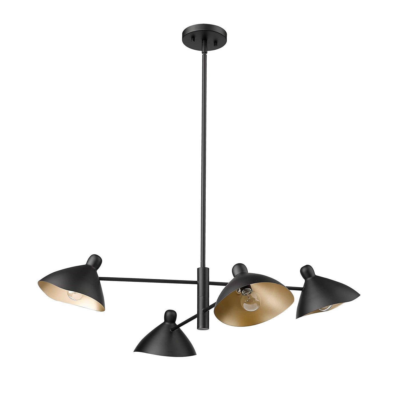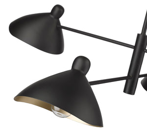 The T-bar light fixtures are finished in matte black and are available in either 4-light or 6-light options. The mid-century shades fold open towards the fixture's center and are completed with a gold interior, providing a warm and intimate light.