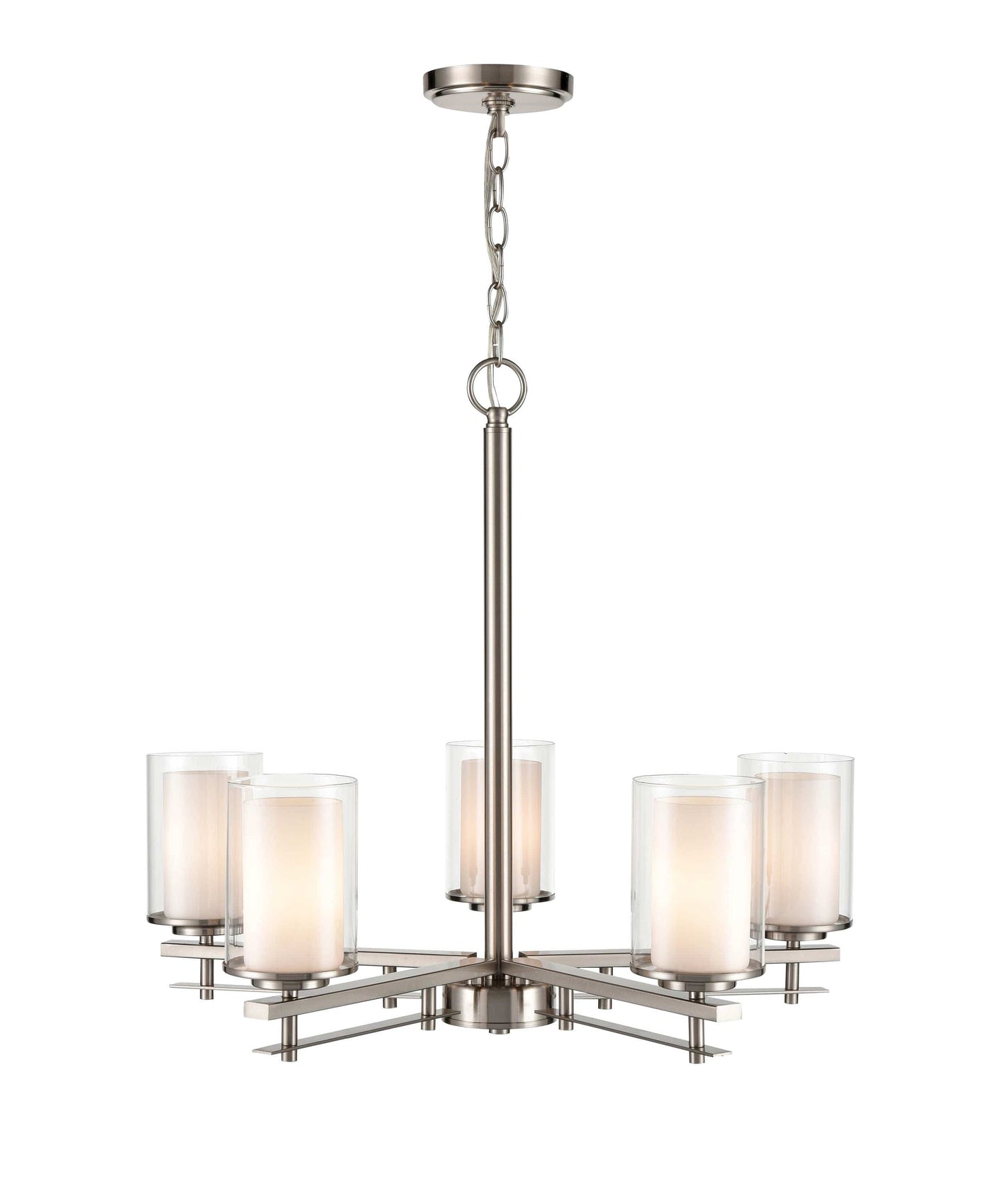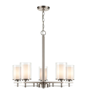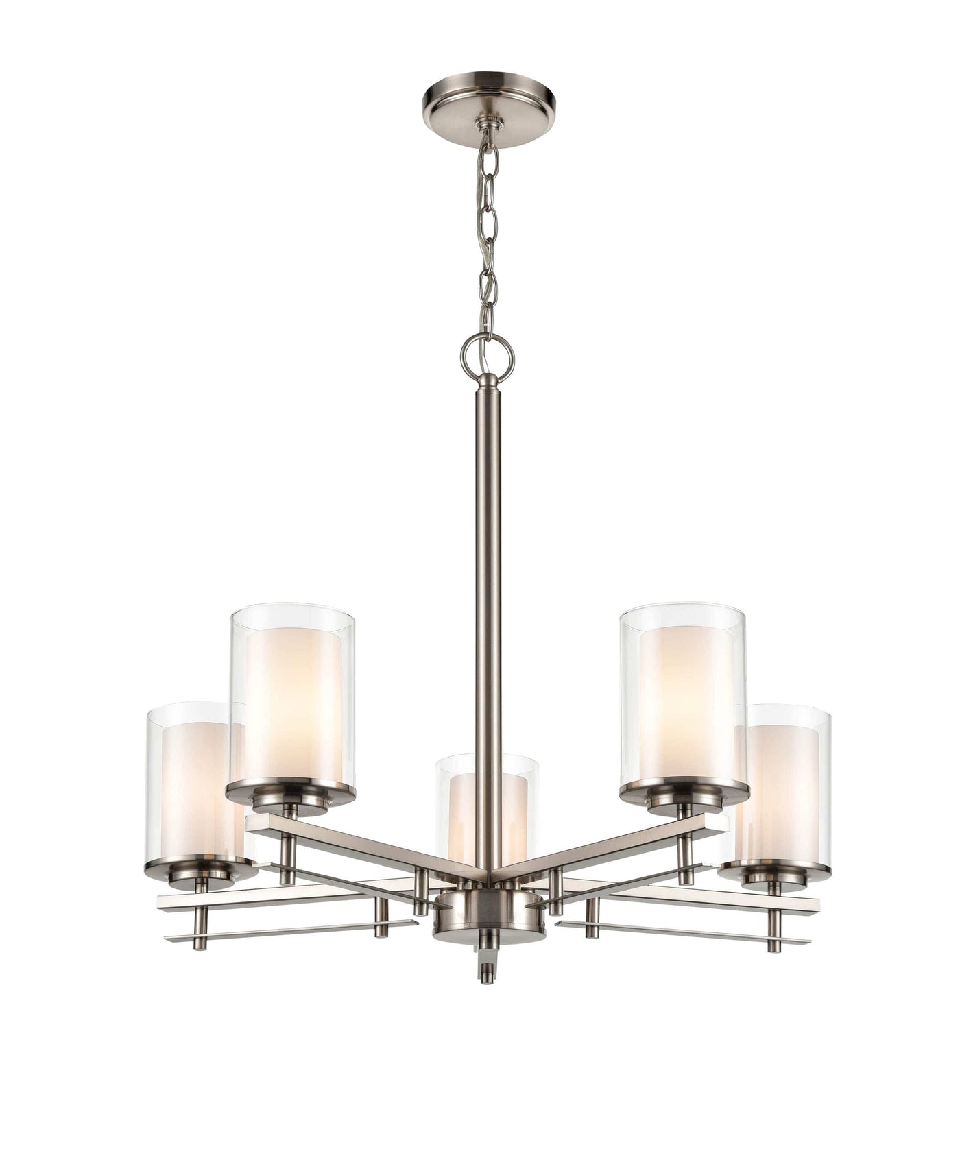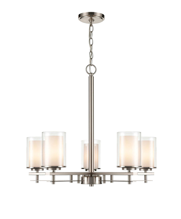 5 Lamps Huderson Chandelier - Brushed Nickel - Clear Out / Etched White Inside Glass - 26in Diameter - E26 Medium Base