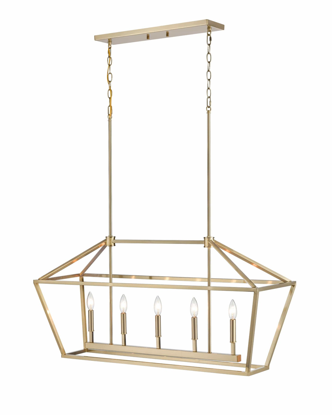 This gold linear lantern chandelier fixture requires 5x 60W E12 Candelabra Base Bulb and includes 60in of Chain.