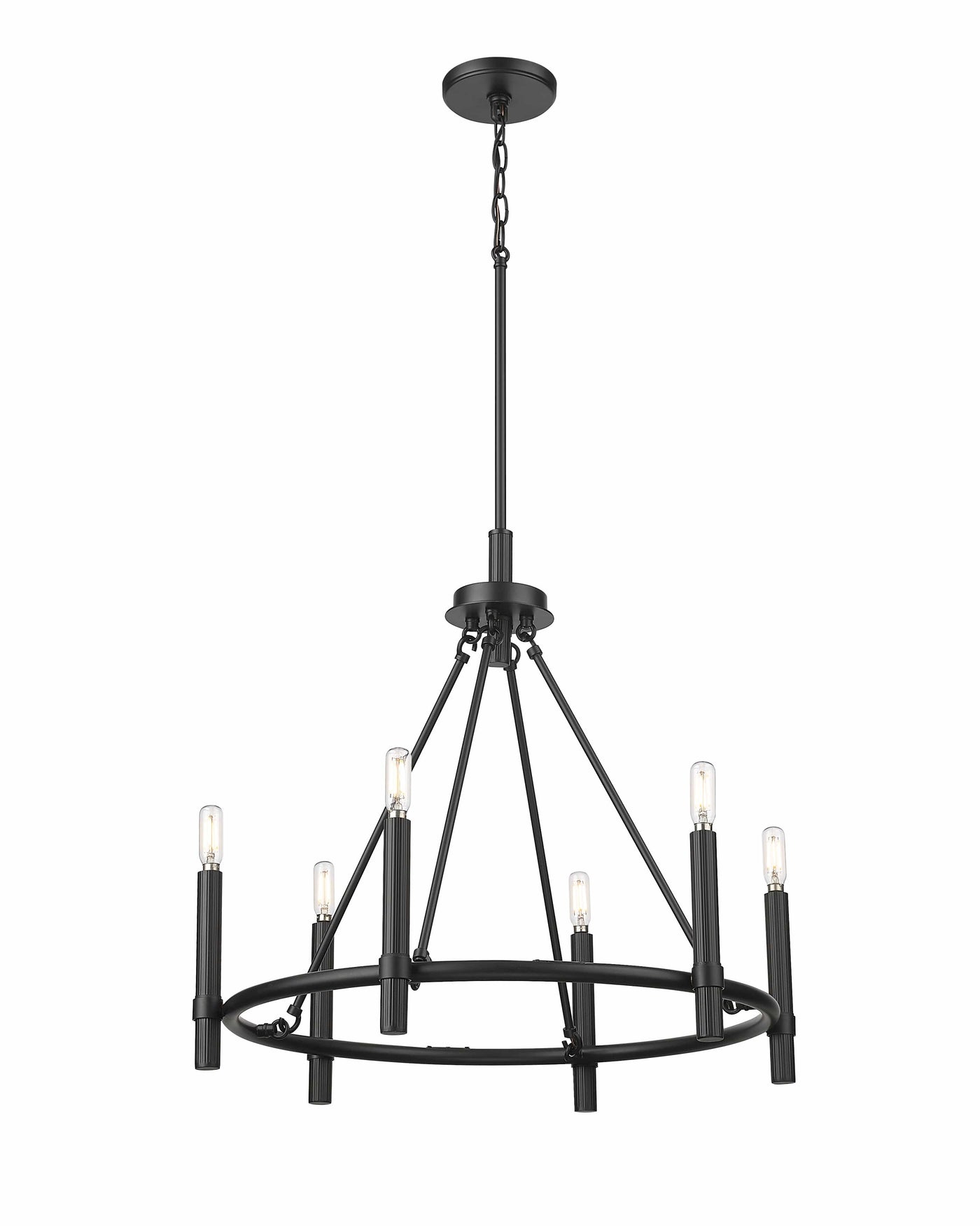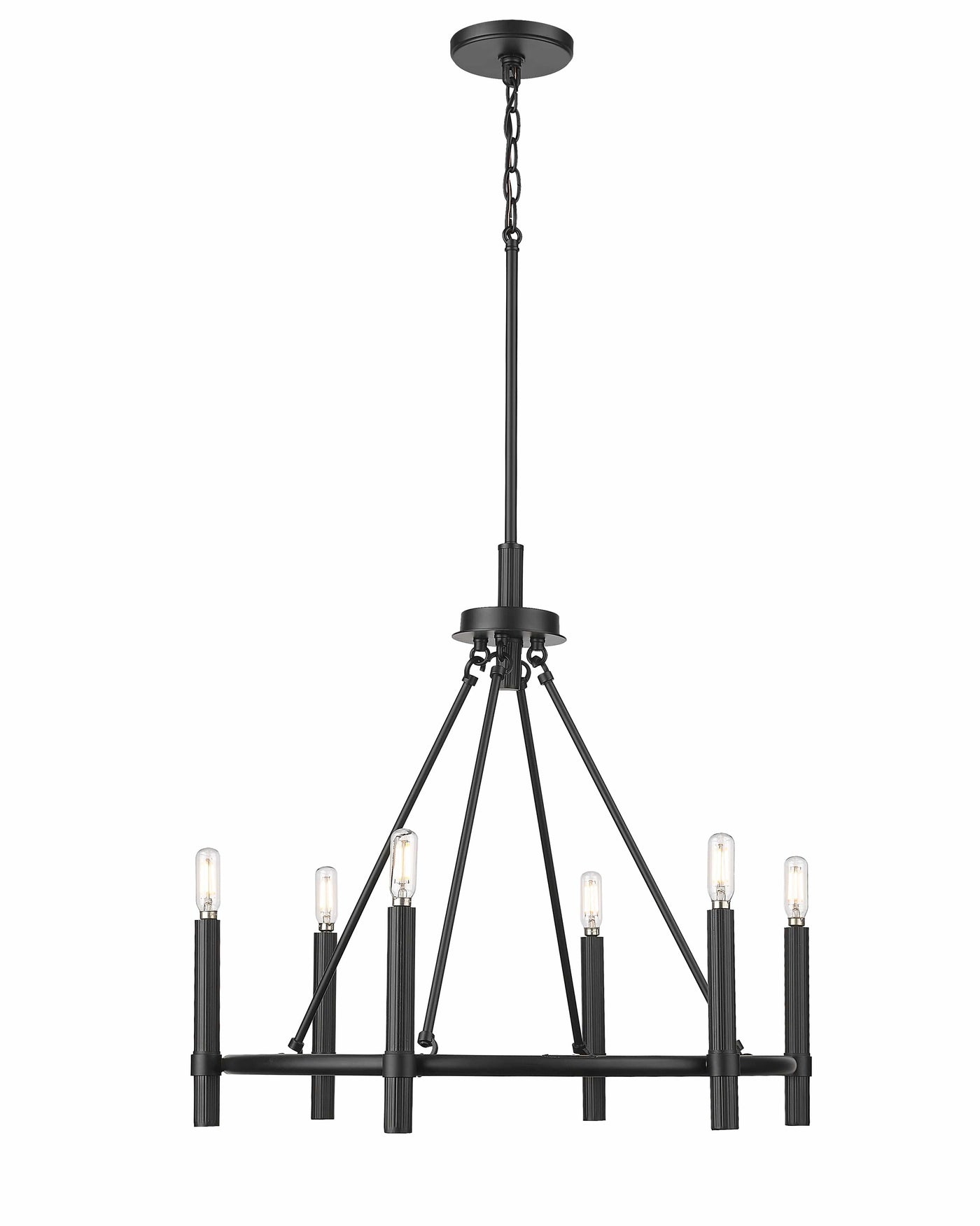 Combining Mid-Century design with sleek and linear Scandinavian simplicity, the fixtures are finished in matte black and feature tubular shaped candles for an electrifying twist.