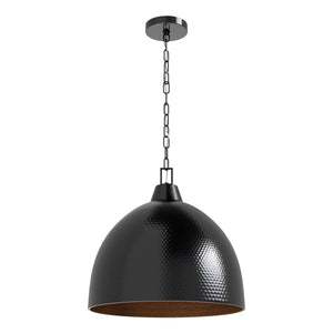 The dazzling finishes of antique silver, aged brass, or black stainless steel are further enhanced by the matte gold interior, and the adjustable chain allows for any ceiling height.