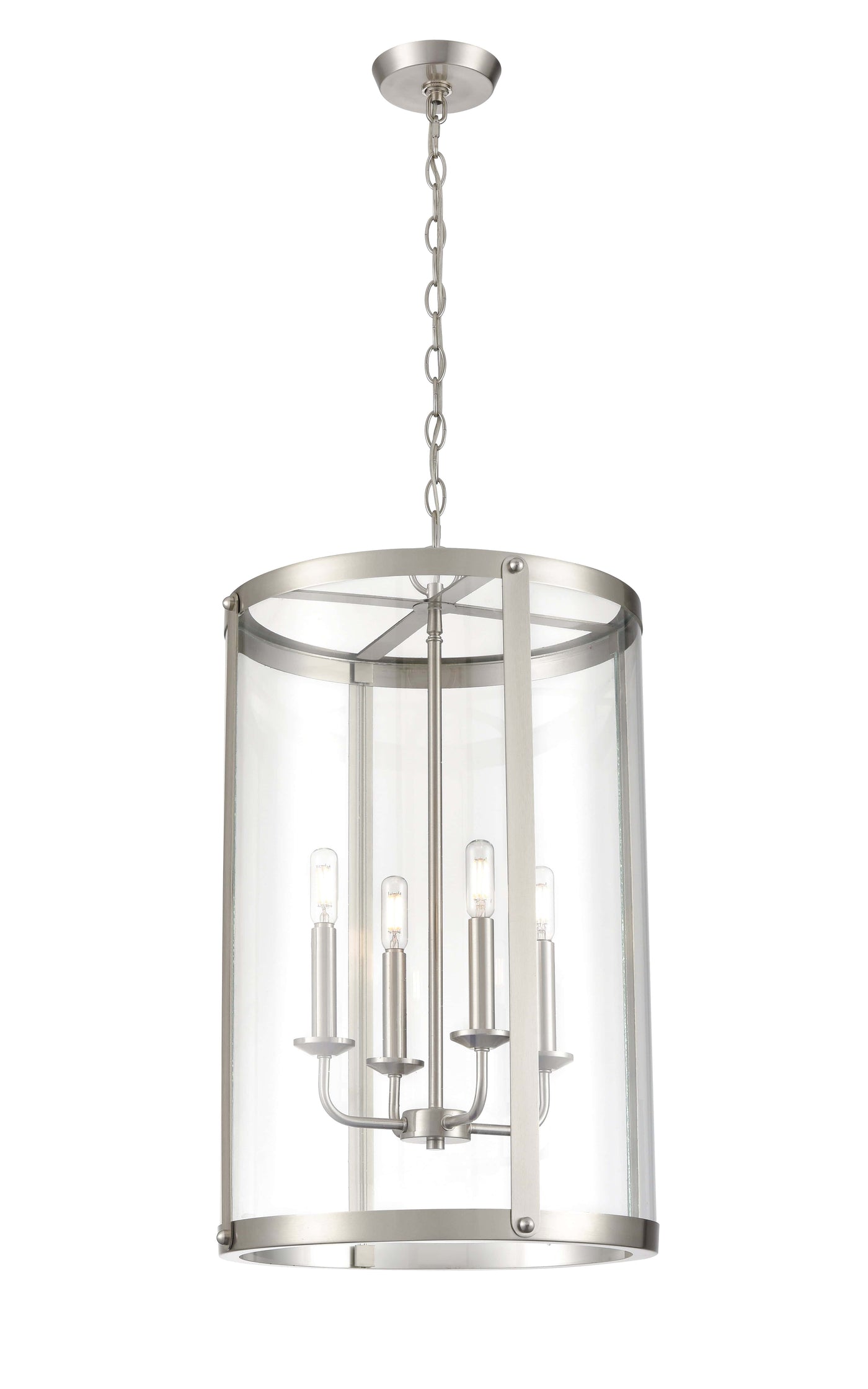 Sparkling clear glass cylinders set into a minimalist steel constructed framework provide abundant light in the Aydenn Collection of pendant lighting.Finished in quintessential matte black or gleaming brushed nickel, these definitive design statements are a bright addition to the foyer or hall.Excellent for kitchen,... View More