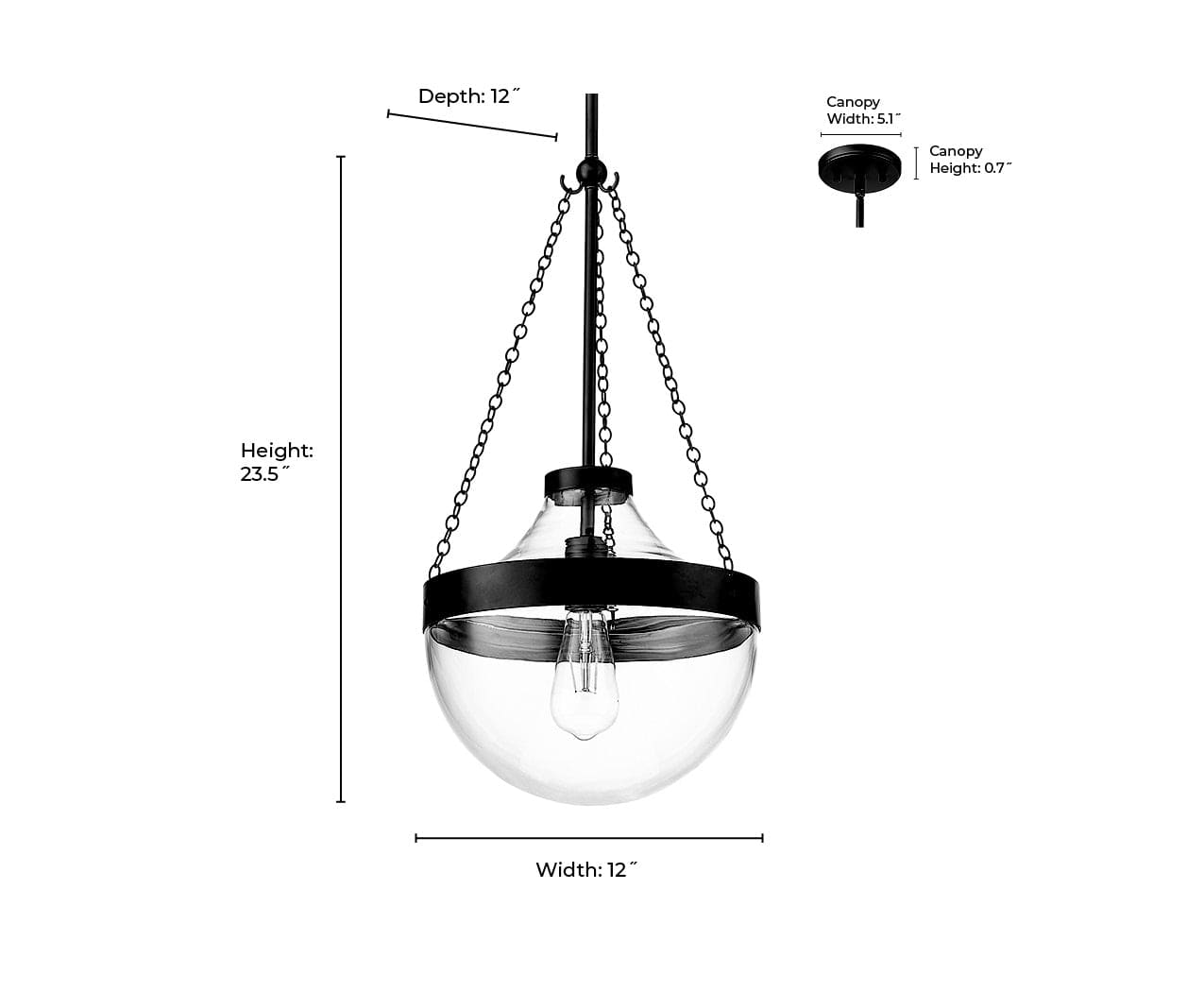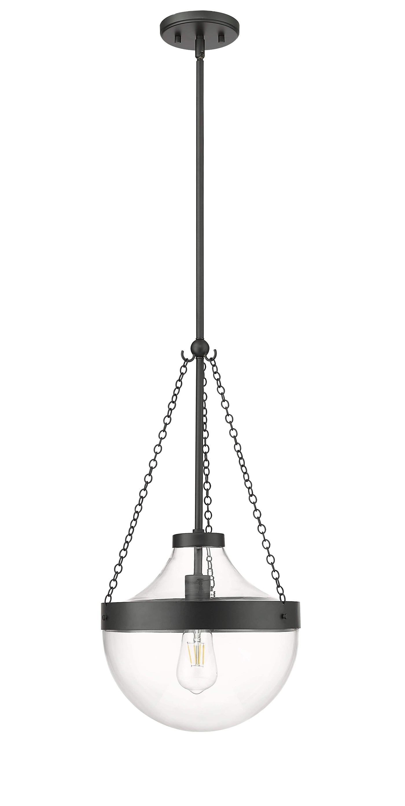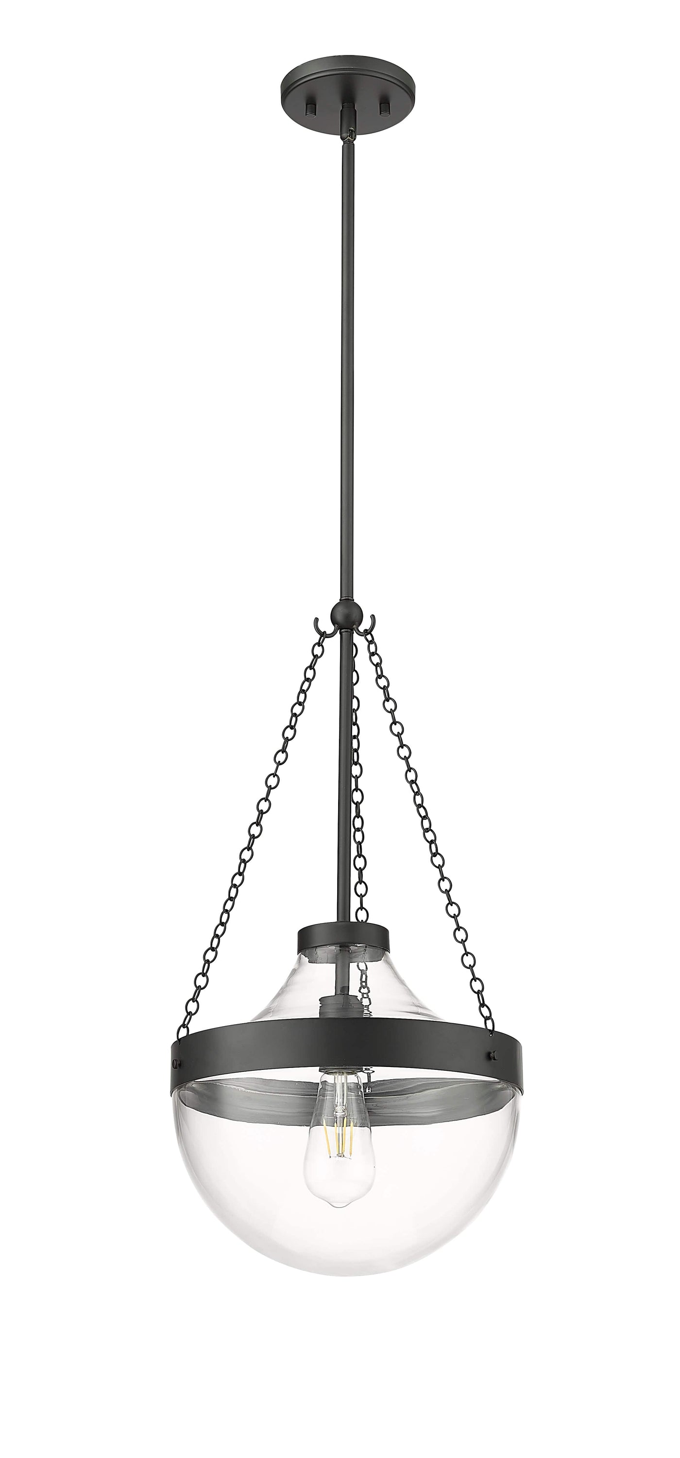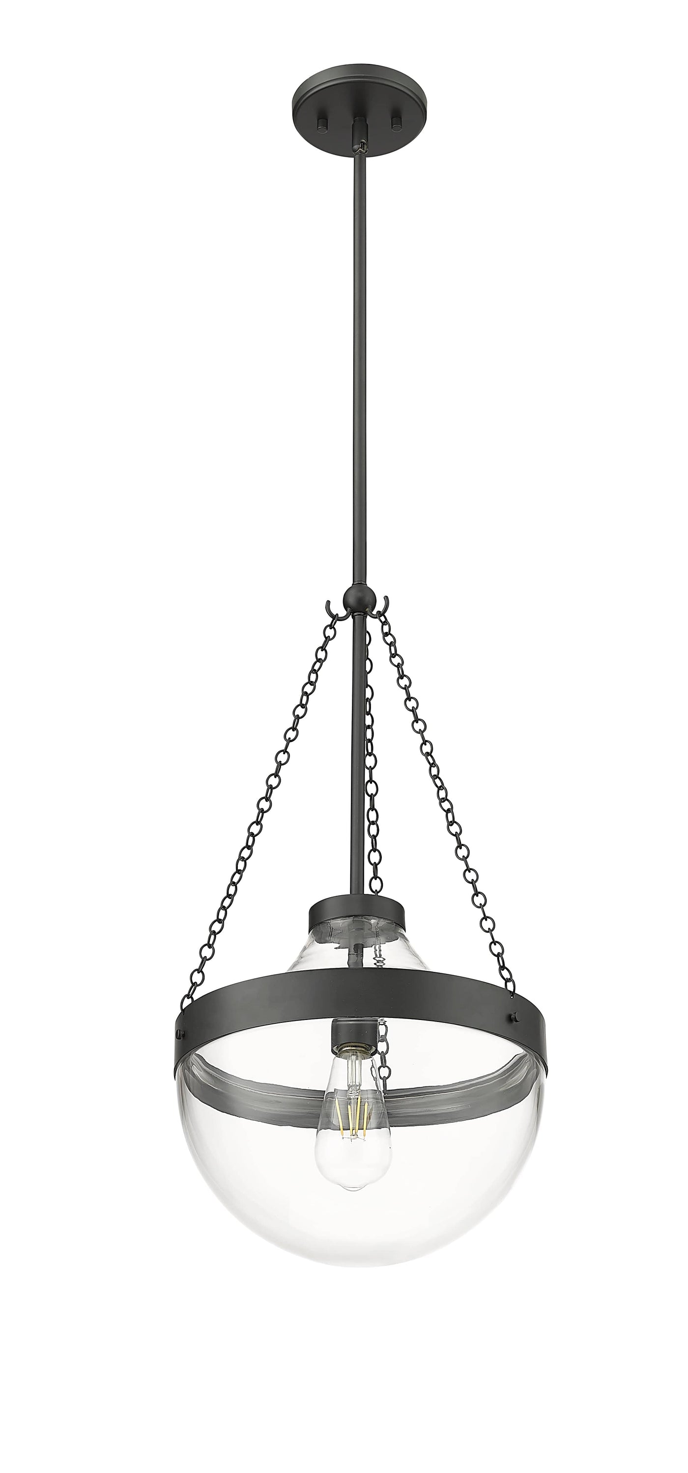 The clear glass bowl perfectly highlights vintage Edison bulbs and nestles in the steel framework suspended by decorative chains.