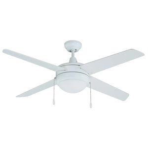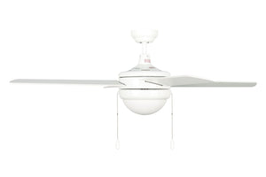 The Europa features four painted plywood blades, 3-speed reversible AC motor, a satin white glass shade, and integrated LED light kit with standard pull chain.