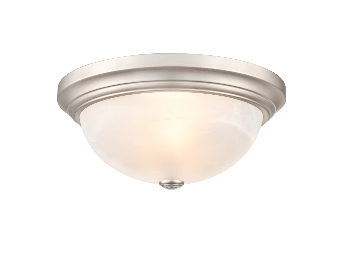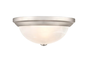 This Flush Mount Fixture is available in a Satin Nickel Finish and includes Faux Alabaster Glass.
