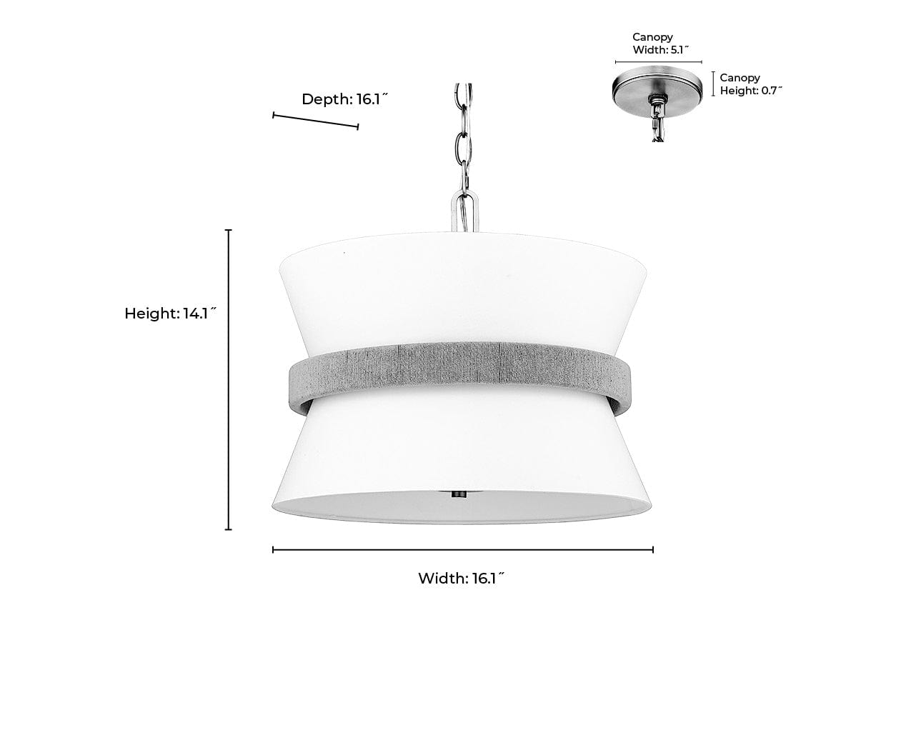 The Kimbry Collection of pendants sets a luxurious tone with white linen drum shades sinched by modern wood accents.