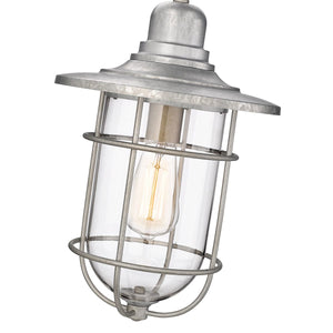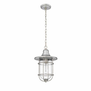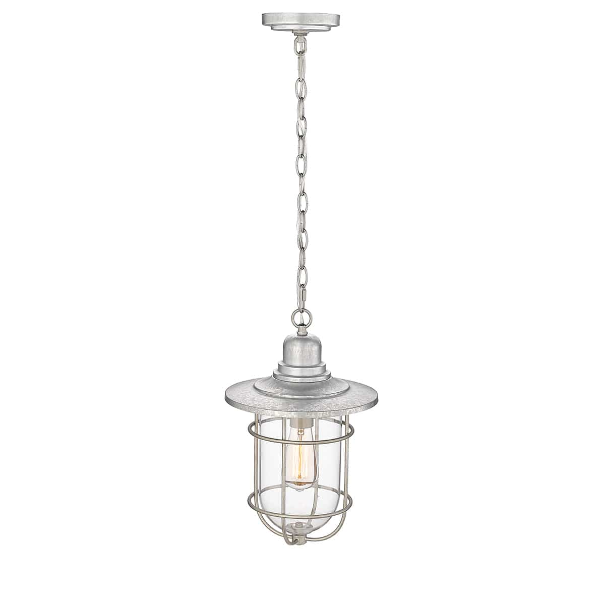 This Outdoor Hanging Lantern features a Galvanized Finish and Clear Glass, and requires 1x E26 60W Max Bulb.The caged lantern pendant fixture measures 10in Wide with a 5ft Chain and is IP Rated for use in Wet locations. View More