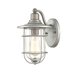 This Outdoor Wall Sconce features a Galvanized Finish and Clear Glass.