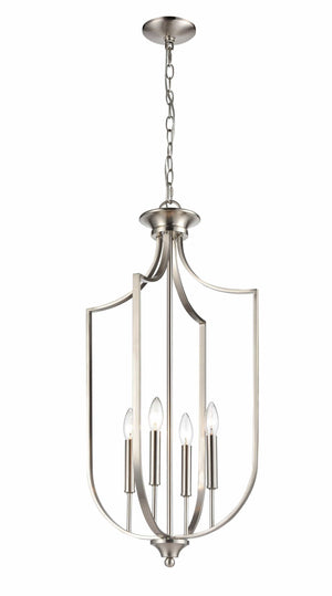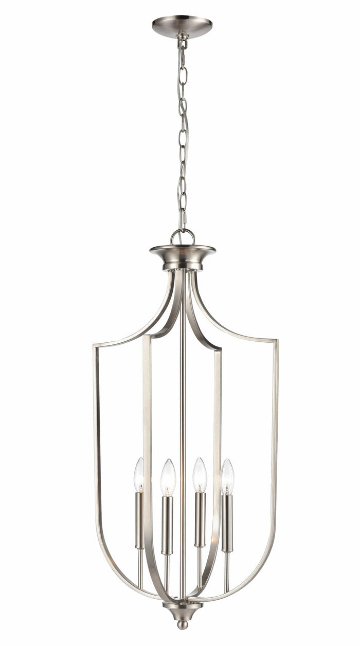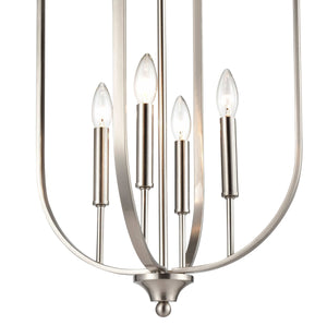 This Pendant Fixture features a Brushed Nickel Finish and requires 4x 60W E12 Candelabra Base Bulb.