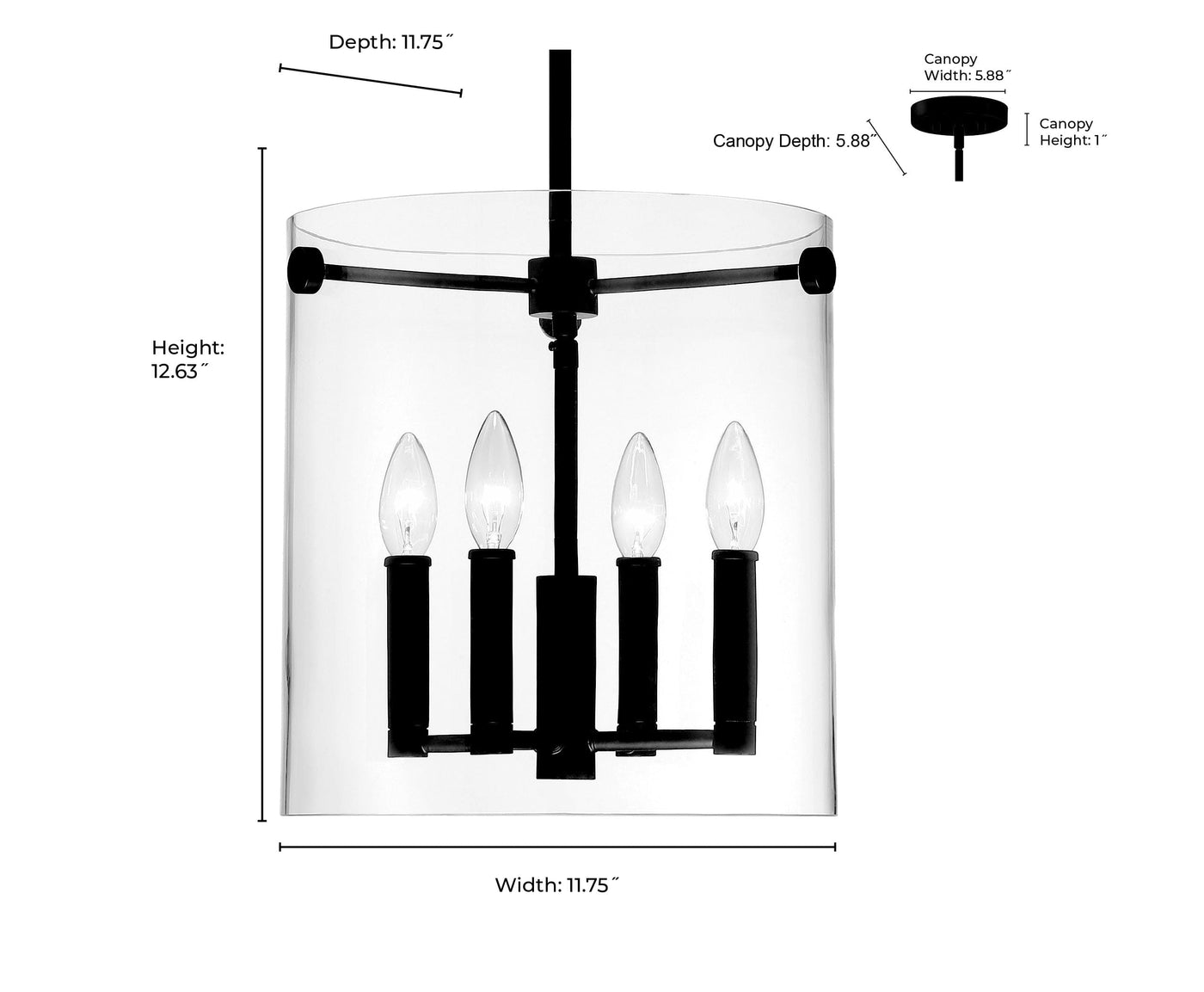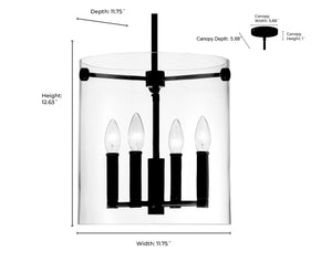 The fixtures feature 4 candle-style lights dramatically suspended within the clear, frameless, floating glass shade for a minimalistic take on traditional design.